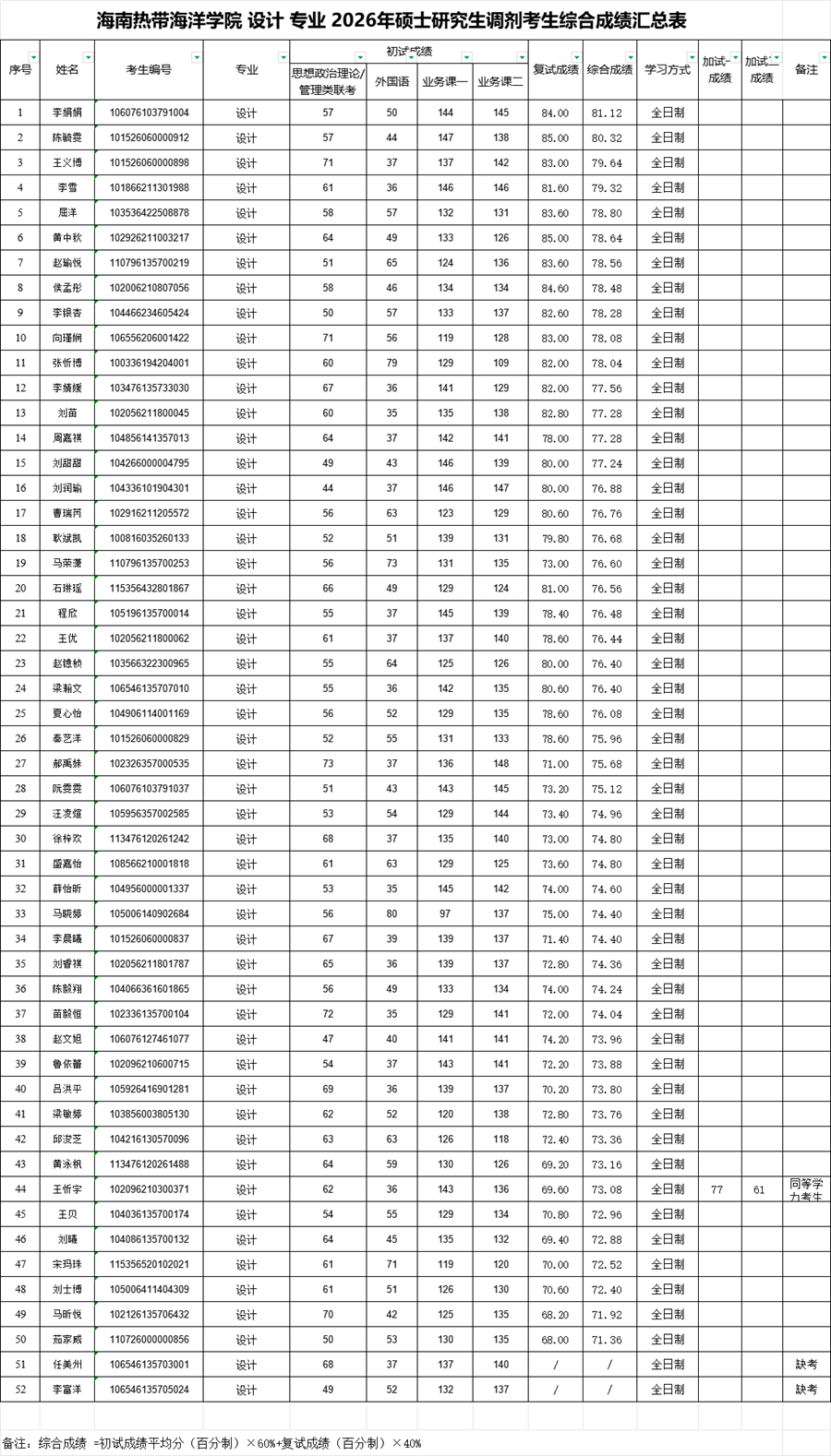 设计专业2026年硕士研究生调剂考生综合成绩公示